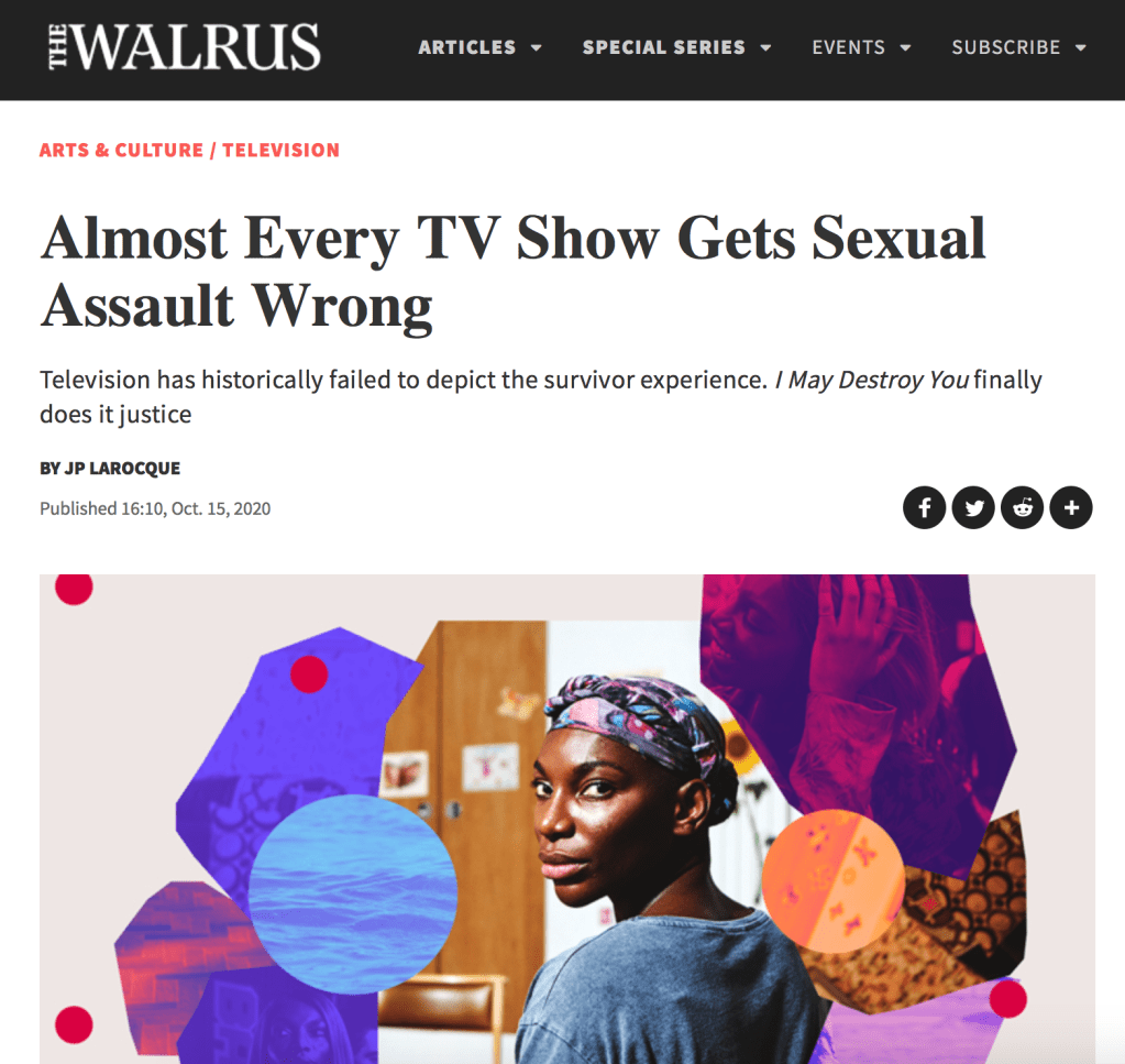 This was a difficult piece, but I felt compelled to write it after being so thoroughly moved by Michaela Coel’s masterful HBO series I May Destroy You. The way in which Coel grapples with memory and trauma is unlike anything I’d ever seen before on television, and it helped me reframe and understand my own assault.