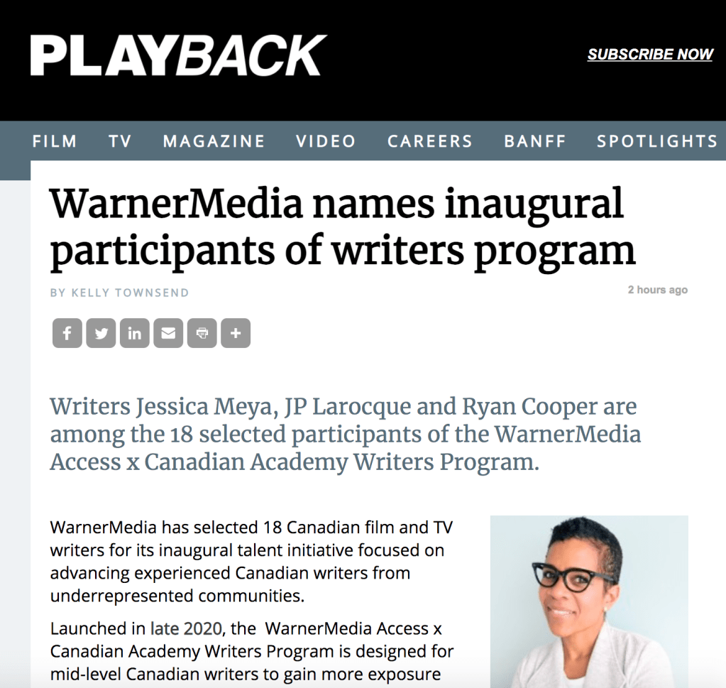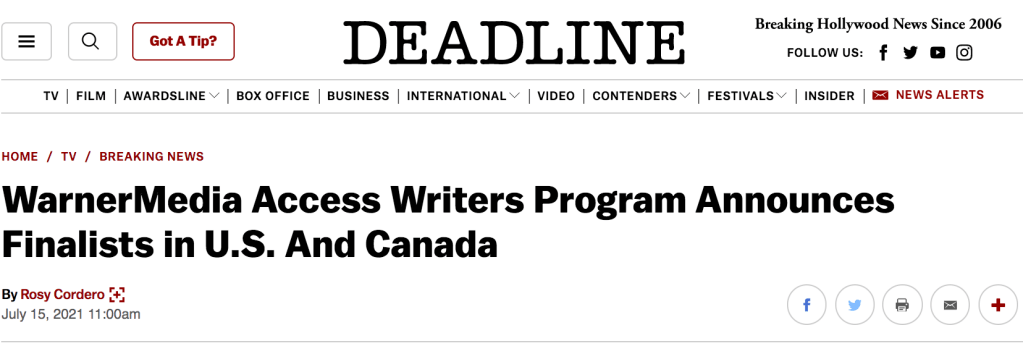 Big news! The press release went out today, but I’ll be participating in the inaugural WarnerMedia x Canadian Academy Writers Access Program! Woo hoo!