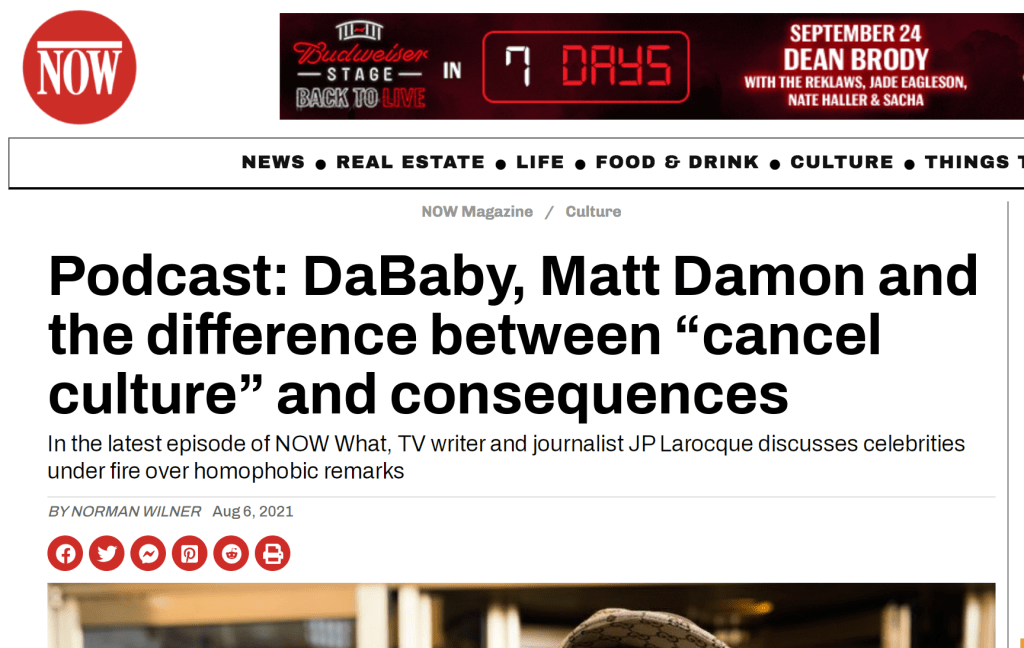 This week, I had the chance to stop by NOW Magazine‘s NOW WHAT podcast, and chat with senior film critic Norm Wilner about some pretty high profile news stories – the whole DaBaby controversy, Matt Damon’s “f-slur,” and the perils of internet “cancel culture.”