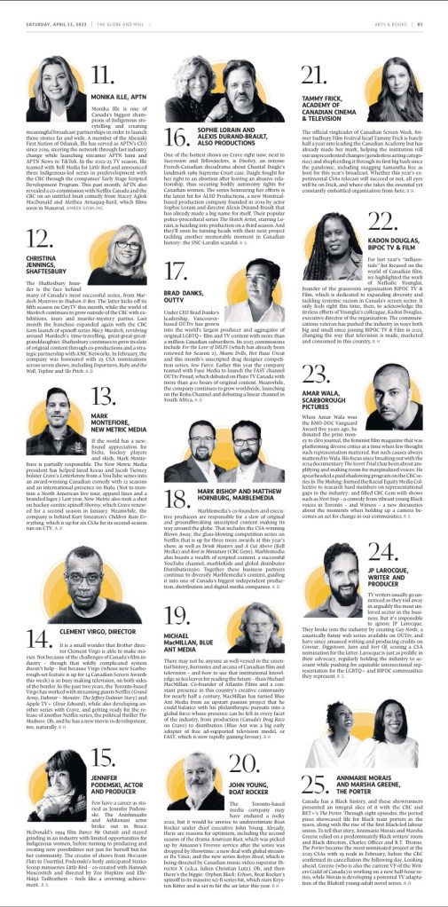 Got some exciting news yesterday — my inclusion on a list in The Globe & Mail of twenty-five influential creatives in the Canadian television industry.